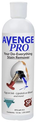 Avenge Spotter has long been the standard for professionals to safely and effectively remove all types of spots, spills, and stains. Avenge Pro„¢ moves to the next level with its unique synergistic action. Avenge Pro„¢ will work alone on a wide variety of difficult stains, including protein stains like eggs, blood, grass stains, and tougher stains like ink, permanent marker, lipstick, shoe polish, grease, oil, tar and more.