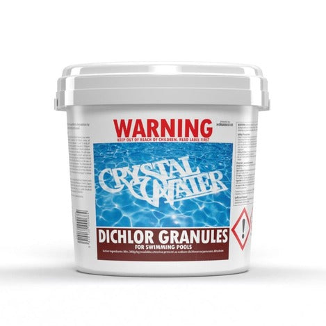 Crystal Water Dichlor Granules is 100% soluble, fast-dissolving stabilised chlorine granules for the control of algae and bacteria in swimming pools.