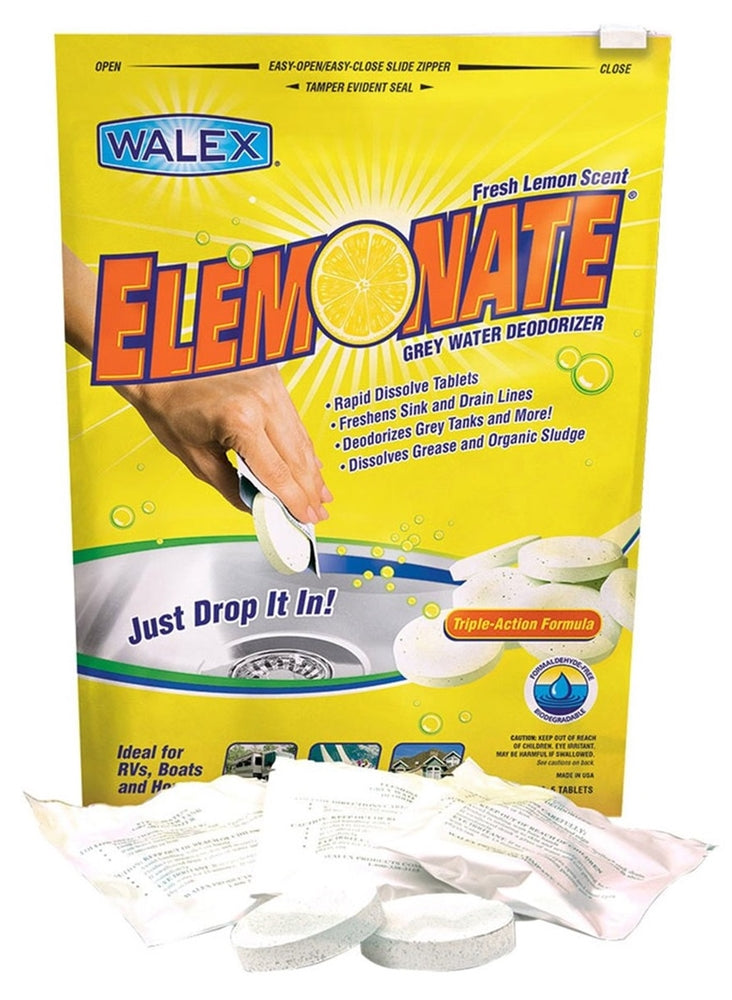 Elemonate is a drop-in deodorizing tablet for your grey water holding tank. Simply drop a rapidly dissolving tablet into your grey holding tank to freshen and clean your drain lines and tank of any grease or sludge.