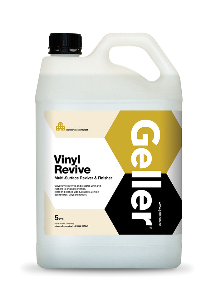 Vinyl and Rubber Restorer Vinyl Revive revives and restores vinyl and rubbers to original condition. Ideal for black bumpers, automotive trim and tyre rubber. Vinyl Revive will give a long lasting shine without leaving a greasy film. Ideal for automotive detailers, car yards, rental cars, and fleet maintenance applications. . No alcohol or harsh solvents. Ideal on polished wood, plastics, vehicle dashboards, vinyl and rubber.