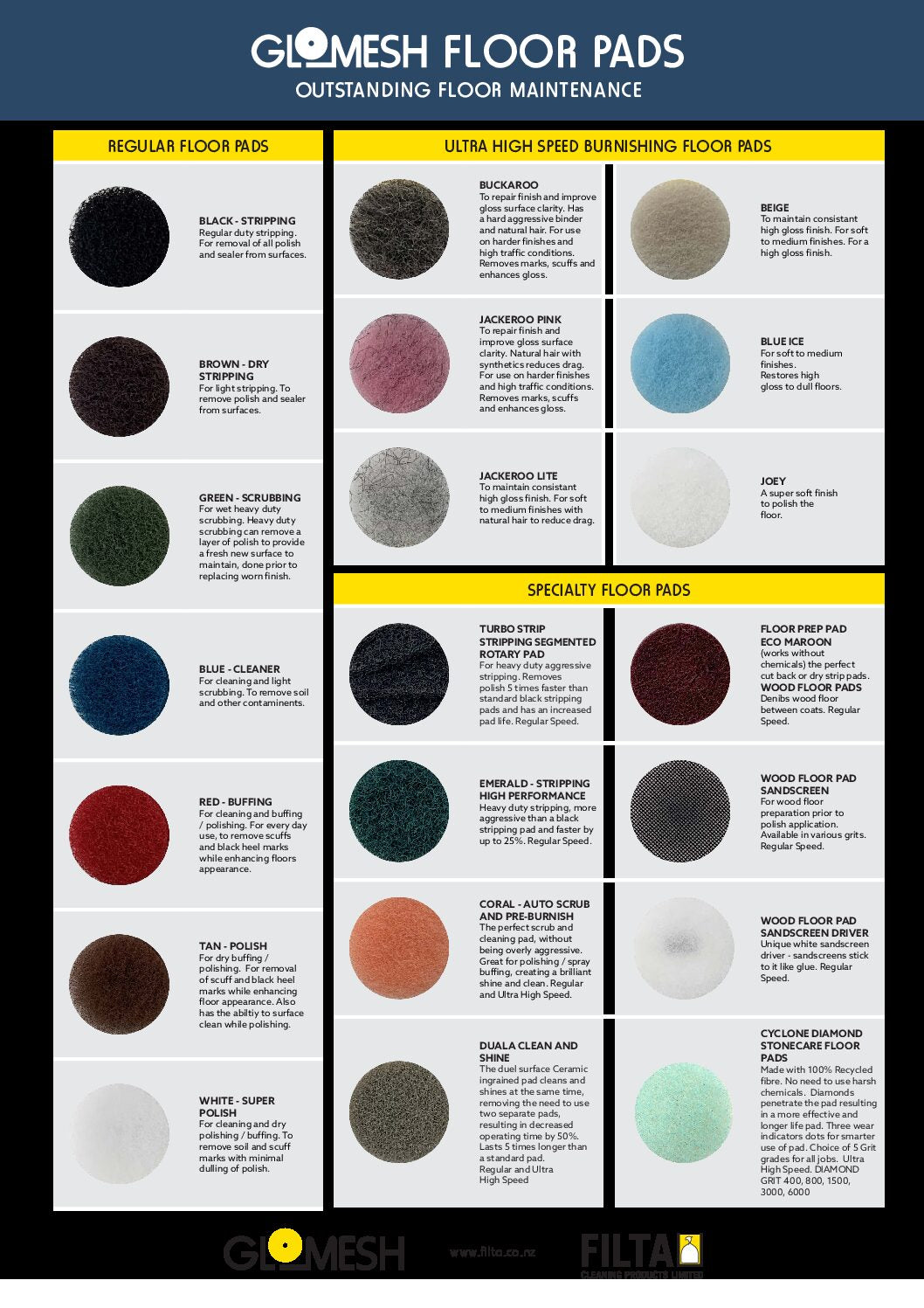 Glomesh - the largest, most comprehensive range of floor and hand pads available in New Zealand.