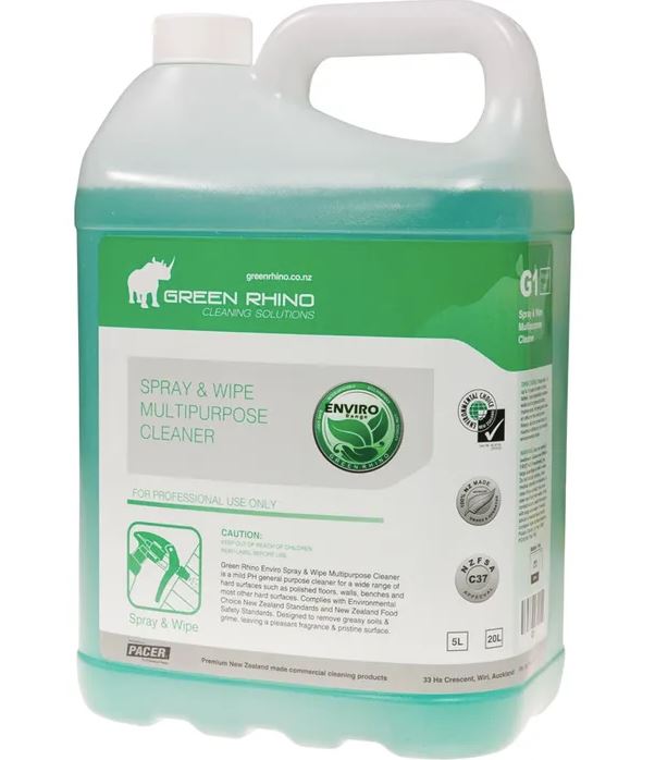 Green Rhino Enviro Spray & Wipe Multipurpose Cleaner is a mild PH general purpose cleaner for a wide range of hard surfaces such as polished floors, walls, benches and most other hard surfaces. Complies with Environmental Choice New Zealand Standards and New Zealand Food Safety Standards. Designed to remove greasy soils & grime, leaving a pleasant fragrance & pristine surface. BENEFITS