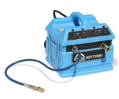 Mytee Hot Turbo is a 2400-watt portable heater that can be hooked up to any cold water extractor to produce hot water. Switches allow you to select either 600, 1200, 1800, or 2400 watts of heat for 210 degree maximum heat.