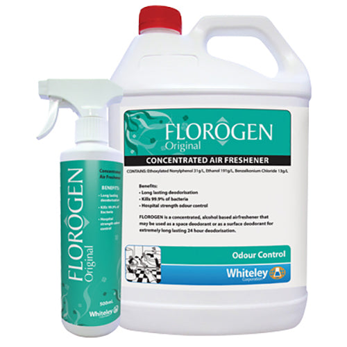Florogen Original is a specially formulated, alcohol-based, surface and space deodorant. Florogen Original removes unwanted odours and provides a positive method for increasing hygiene in the immediate area of use. Florogen Original has a pleasant fragrance and kills 99.9% of bacteria